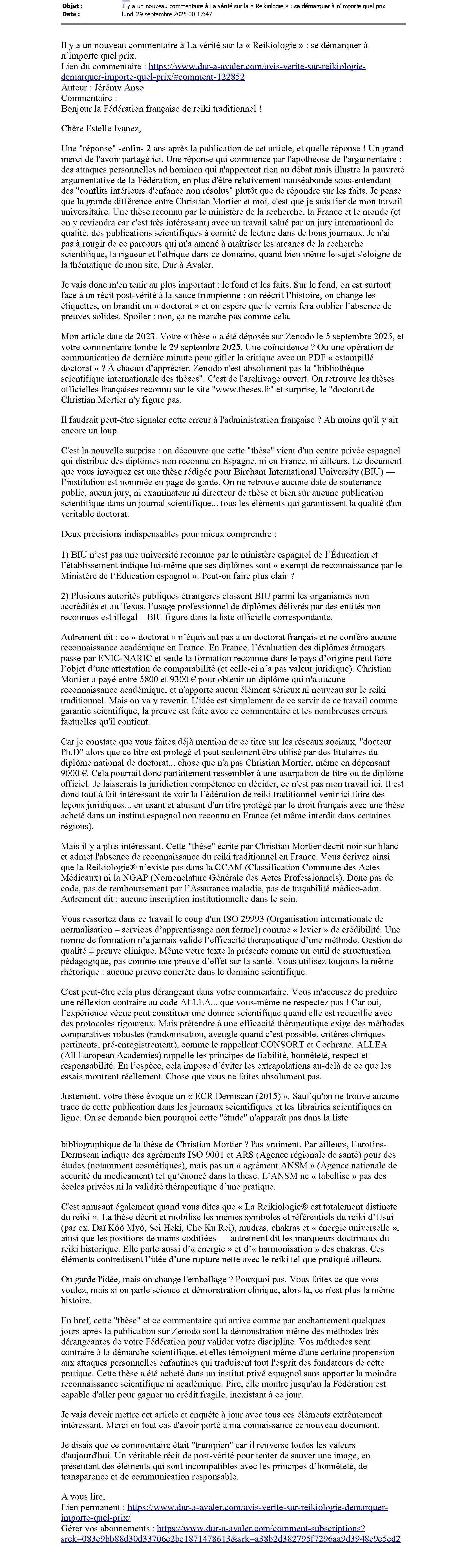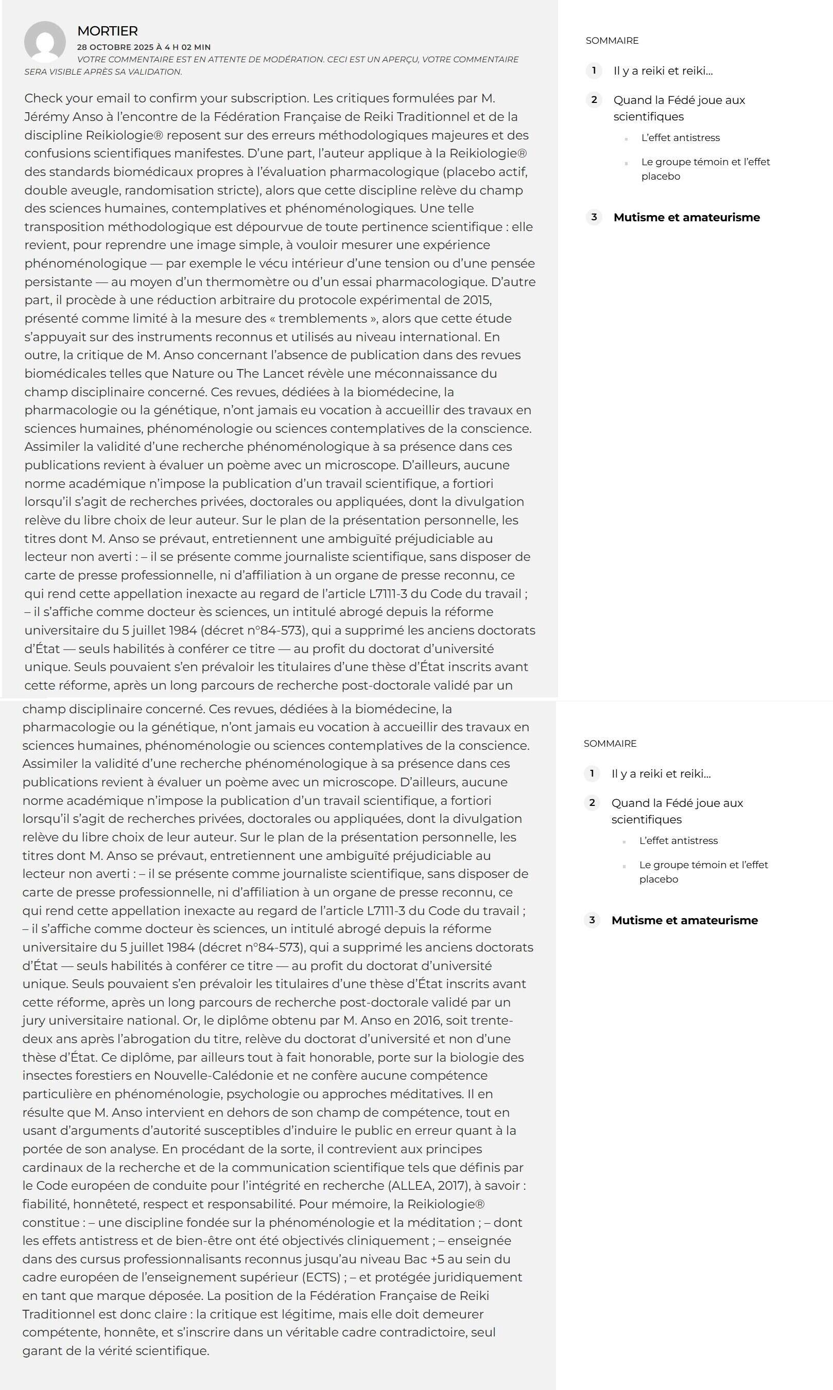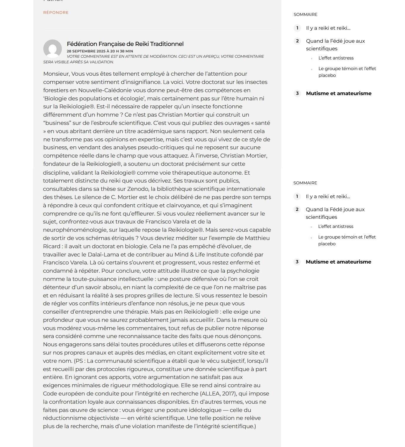 Nous avons rédigé un commentaire sous l'article en question, afin d'avoir droit à un contradictoire, qui nous permet de rétablir la vérité sur la Reikiologie®.